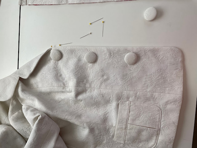 Testing out the button placement on the edge of the horizontal buttonhole. It looks like the button is 1/4" from the front edge, which is just what I wanted.