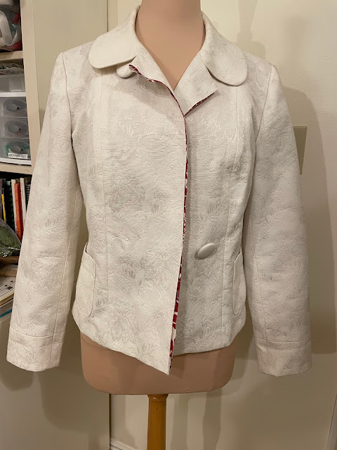 This is a beautiful Talbots jacket that I acquired while thrifting. It is a jacquard weave damask fabric with a fun red/white print lining. I am not a fan of double-breasted jackets, mainly because I love to keep my jackets open. Because of this, I decided to convert the front closure to a single-breasted closure. Here is how I did it and you can too!